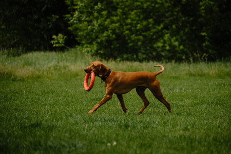 Dog plays with a round orange toy in a green field in spring. Cute active Hungarian Vizsla walking outdoor in a green grass in summer. Atmospheric photo of pet in move