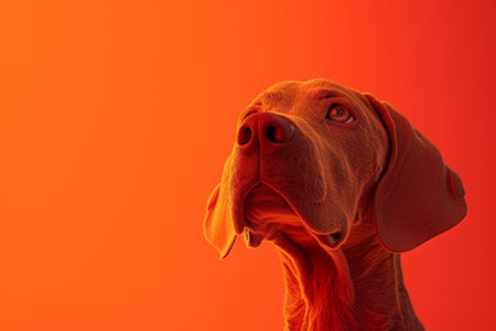 vizsla dog wearing jacket and hood on orange background. Copy space