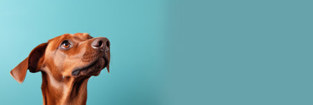 A closeup shot of a Visla dog (Hungarian pointer) with a blue and green background.