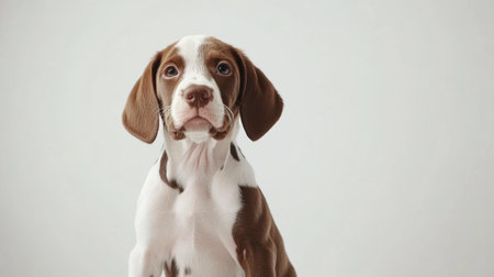 A charming puppy with a mix of brown and white fur gazes intently, perfect for capturing the joy and innocence of young pets in a serene environment.