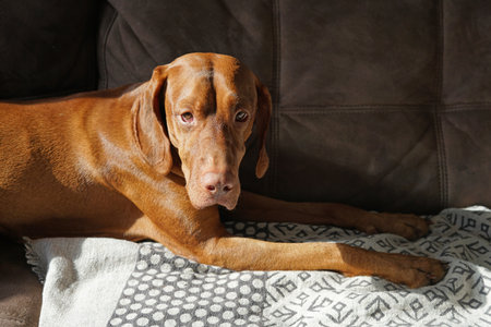 A contemplative brown dog enjoys a quiet moment in the sunlight on a cozy suede couch.