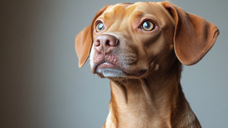 Cute Young Dog with Big Bright Eyes Posing Against a Soft Gray Background in Studio Lighting