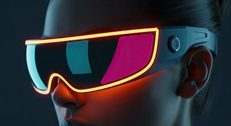 Close up of futuristic woman in holographic smart glasses