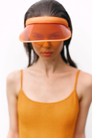 Young woman with long hair wearing an orange visor and a matching dress, evoking a summer aesthetic and fashion-forward vibe.