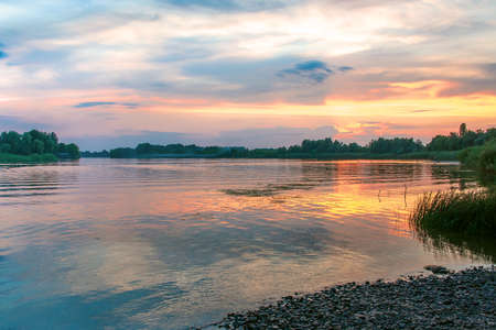 A sunset or sunrise scene over a lake or river with skies reflecting in the water on a summer evening or morning. Landscape.