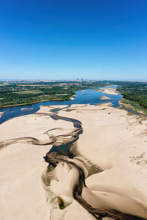 Low water level in Vistula river, effect of drought seen from the bird's eye perspective. City Warsaw in a distance.