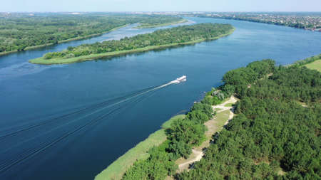 Aerial view. Hydrofoil vessel sails along the Dnieper River in Ukraine.