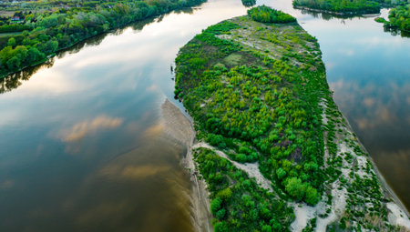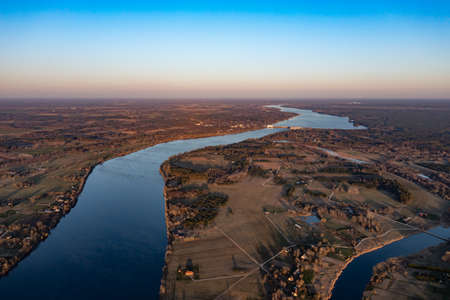 The Vistula, the largest Polish river. View from a drone near Warsaw. The beautiful river and wild banks are a great attraction and a habitat for many species of animals.