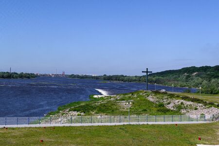 The river flows through the city. Church on the hill above the river. Wisla River in Krakow. Float the boat and the ship under water