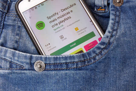Rio de Janeiro, Brazil - February 14, 2020: Logo Spotify on the Moto G5s Plus smartphone screen, in the jeans pocket. is a music, podcast and video streaming service