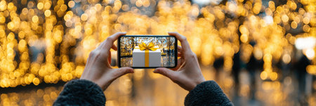 A person captures a wrapped gift on their smartphone while surrounded by vibrant, twinkling lights during a festive evening celebration.
