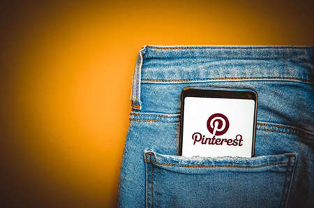 Pinterest. Smartphone in a pocket of blue jeans on a Pinterest smartphone screen on a blue, yellow, black background. Country July 2020. Kiev, Ukraine.