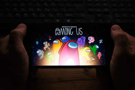 Kostanay, Kazakhstan, November 04, 2021. A man holds a mobile phone with a screensaver of the popular TAmong Us game