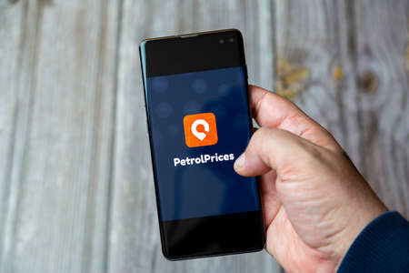 04-13-2021 Portsmouth, Hampshire, UK A Mobile phone or Cell phone being held in a hand showing the Petrol prices app on screen