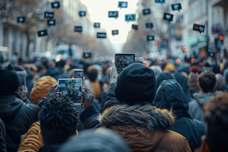 Graphic background of multiple people taking smartphone photos of painting at modern art gallery exhibition, copy space