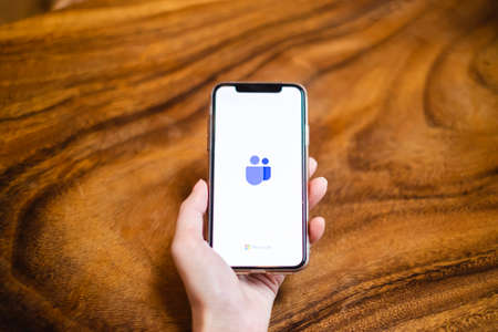 BANGKOK, THAILAND - MAY 17, 2020: A user opens the Microsoft Teams application on smartphone screen on the wooden desk. Microsoft Teams is a popular application suitable for working from home.