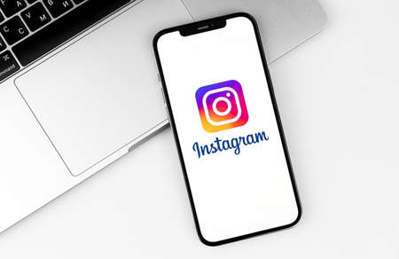 Instagram mobile app on screen smartphone iPhone, notebook, workplace background. Instagram is a photo-sharing app for smartphones. Moscow, Russia - April 14, 2021