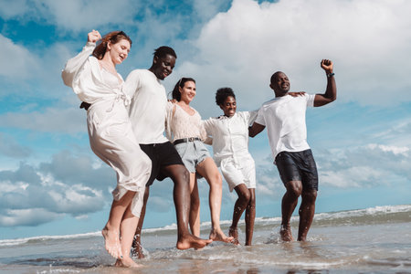 Diverse group of friends enjoying active lifestyle by dancing and splashing water on the beach. summer fun, movement, and joyful friendship.