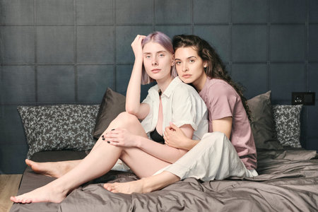 Portrait of serious young Caucasian women in sleepwear sitting on satin linen and hugging in bedroom