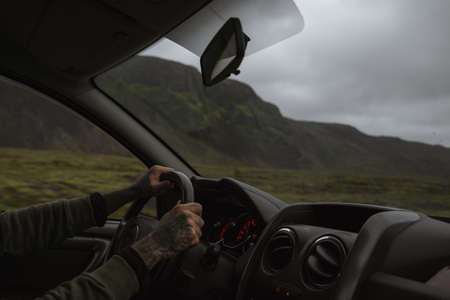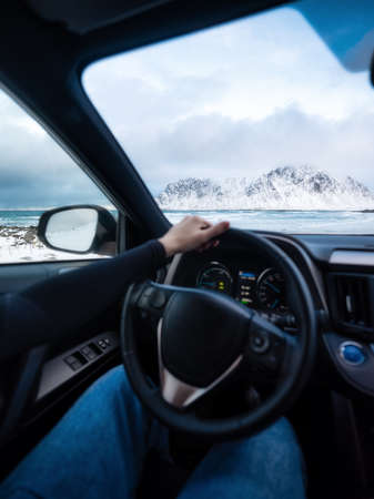 View from car window on the road and pity strange landscape with a mountains, rocks and cloudy sky and hand of woman. Landscape through windscreen in Norway. Single trip for isolation in a coronavirus