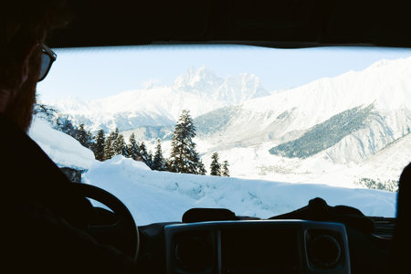 Caucasian young male driver tourist with rented vehicle on snowy mountain Winter road drive in Svaneti driving towards snowy Ushba peaks in scenic caucasus mountain view