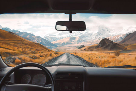 Exploring remote mountains by car, enjoying panoramic views and the serenity of open landscapes. Generative AI