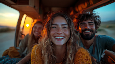 Three friends enjoying a joyful moment inside a camper van during sunset on a road trip adventure. Generative AI