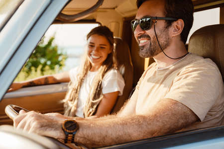 White happy couple smiling while driving trailer on summer day