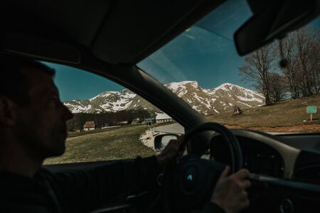 Caucasian man sitting at the car and riding to the new places while traveling