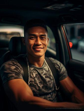 portrait of a handsome young man sitting in the backseat of a car, created with generative ai
