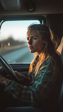 Realistic portrait of a determined female truck driver, framed inside the cab of her truck, highway visible through the windshield, showcasing professionalism and resilience