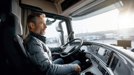 A smiling, bearded truck driver sits in the cab of his vehicle, looking forward with confidence and satisfaction.