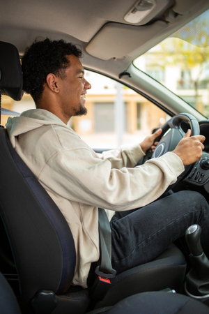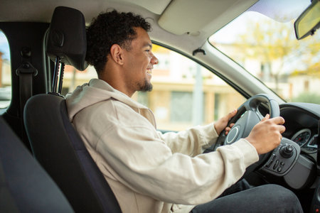 Young man in a beige hoodie driving a car, smiling while holding the steering wheel. Side profile view inside a vehicle during daytime