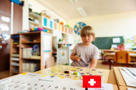 Background with cute little boy working in classroom, self made swiss flag, swiss primary education