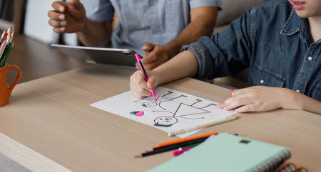 Back to School and Hands-On Learning. A father and son work together on educational materials, enhancing learning experiences.
