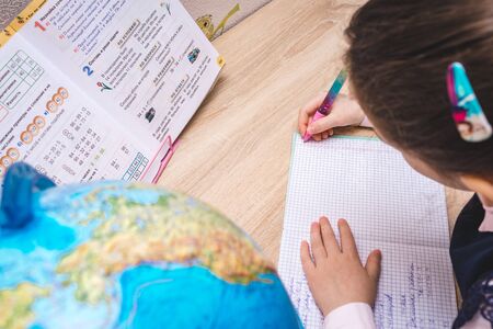 little child doing schoolwork sitting at home, holding a pen in a hand on a background of the globe