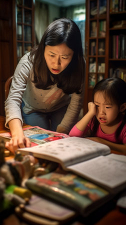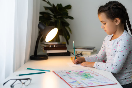 a child girl doing homework writing and reading at home