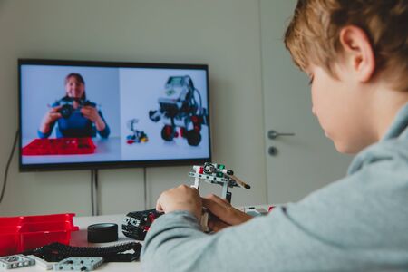 kid building robot with online robotic technology lesson