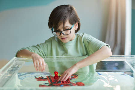 Kids development classes. Unrecognizable little boy playing logical game during psychological consultation, empty space