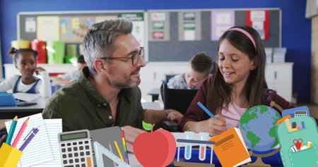 Image of school icons over male teacher and school children in classroom. education and learning concept digitally generated image.
