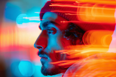 A profile silhouette of a man wearing a cap, overlayed with vibrant colors and abstract light streaks