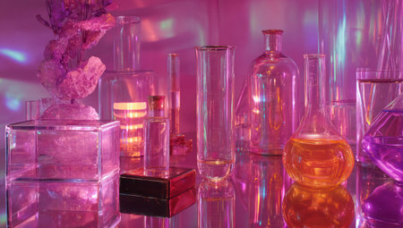 Various laboratory glassware filled with colorful liquids are arranged in a studio setting. The image showcases a collection of transparent beakers, bottles, and tubes. The composition features a vibrant mix of pink, orange, and purple hues with a reflective surface. This could be used for scientific articles and creative advertising.