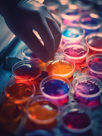 Scientist hand holding petri dish with colorful liquid in laboratory.