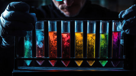 A focused scientist conducts a colorful chemistry experiment in a laboratory, holding test tubes filled with vibrant liquids, showcasing exploration and innovation.