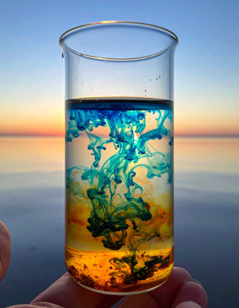 Against the tranquil backdrop of a sunset over water, vibrant blue and yellow inks swirl and mix within a glass beaker.