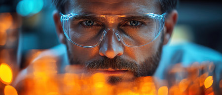 Focused scientist examining a molecular model with protective glasses