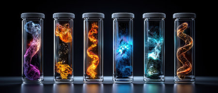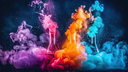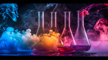 Array of chemical flasks filled with colorful liquids, surrounded by swirling vibrant smoke, creating a visually captivating, experimental science scene.