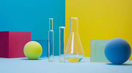 A vibrant modern composition featuring laboratory glassware and colorful geometric shapes arranged on a bright surface.