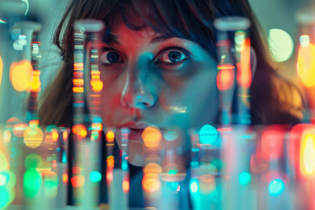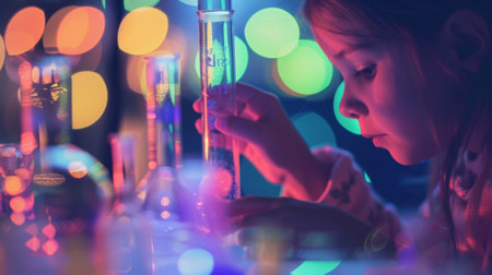 A woman examining colorful test tubes in a laboratory with bokeh effect AI generated