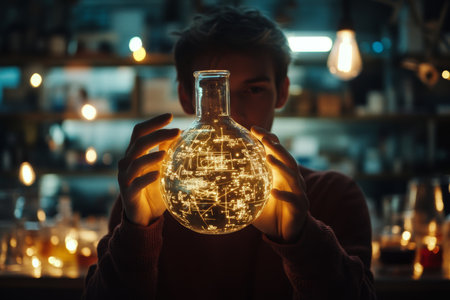 Person holding a glowing flask with equations in a nighttime laboratory innovative science concept
